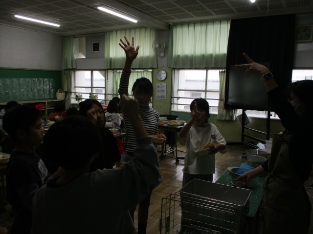 5年生の給食の様子を見に行くと、おかわりじゃんけんで盛り上がっていました。