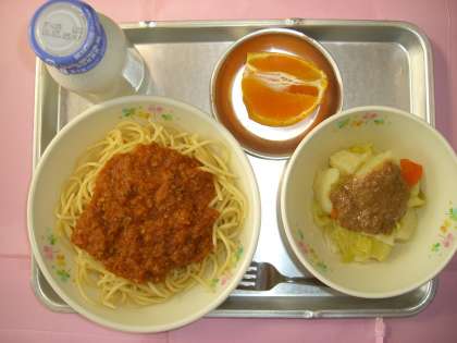 スパゲティーミートソース ボイル野菜のごまソース くだもの 牛乳