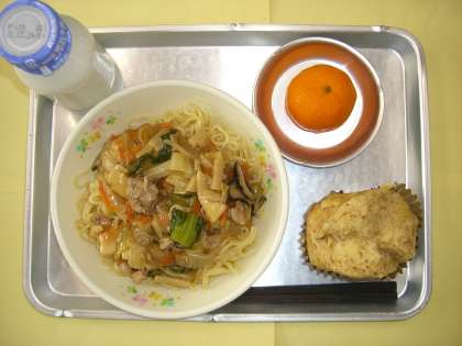 フルーツ蒸しパン 五目あんかけ焼きそば くだもの 牛乳