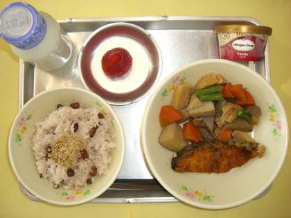 赤飯 鰆のみそ焼き 筑前煮 くだもの アイスクリーム 牛乳