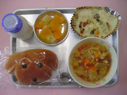 こいぬパン アスパラと豆腐のグラタン ミネストローネ フルーツかん 牛乳