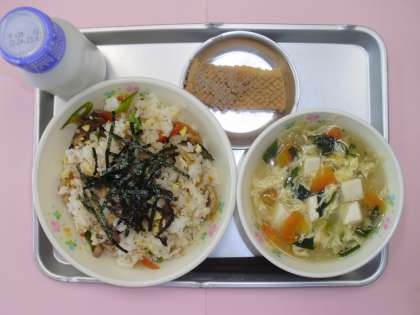 五目ちらし寿司 いかのまつかさ煮 かきたま汁 牛乳