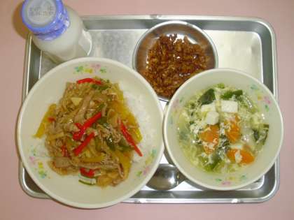 カラフルチンジャオロースどん たまごスープ くるみこくとう 牛乳