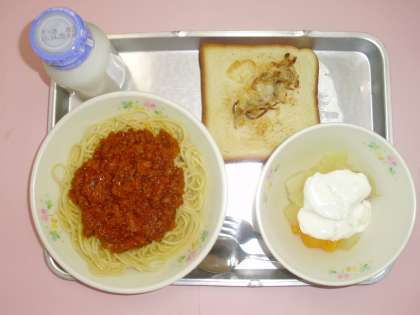 スパゲティーミートソース じゃこラスク フルーツヨーグルト 牛乳
