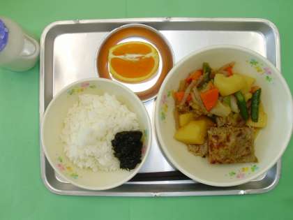 ごはん のりの佃煮 あじのさんが焼き 肉じゃが くだもの 牛乳