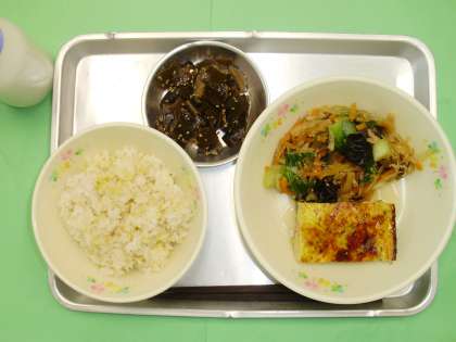 ごこくごはん かにたま 春雨の中華炒め しいたけこんぶ 牛乳