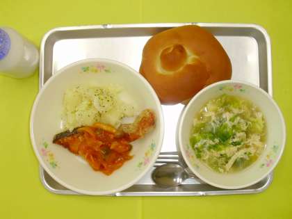 ミルクパン 鮭のトマトソースがけ こふき芋 レタスと卵のスープ 牛乳