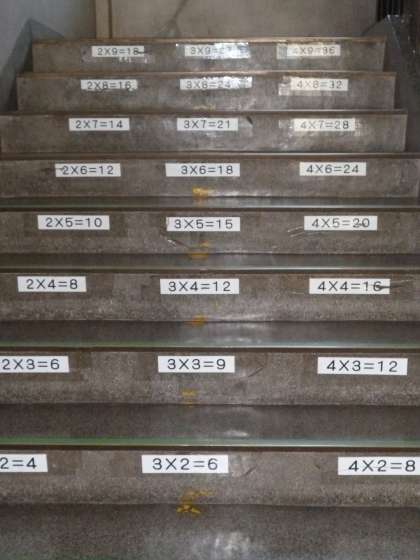 これは、階段です。でも、普通の階段ではありません。なんとかけ算九九が、書いてあるのです。このかけ算九九 は、とても便利です。その理由は、歩きながら九九おぼえられるからです。ぼくも、2年生のときに歩きながら覚えていました。でも特に難しかったのは、かけ算の9の段です。9の段は、数が大きいのでおぼえにくかったです。でも、がんばって覚えました。