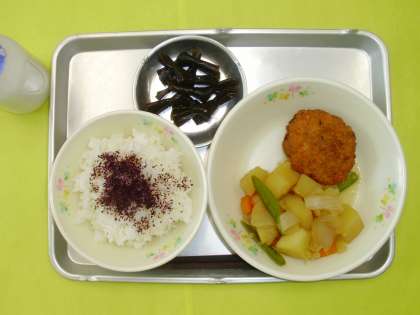 ゆかりごはん 豆腐のまさご揚げ じゃがいものうま煮 結び昆布の煮物 牛乳