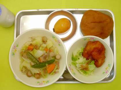 フィッシュサンド ボイルキャベツ ウィンナーポトフ びわ 牛乳