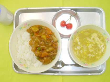 スープです。コーンや玉ねぎの甘みを味わうことができたかな☆さくらんぼは、