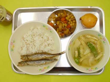ごまごはん ししゃも 五目煮豆 みそ汁 びわ 飲み物リザーブ