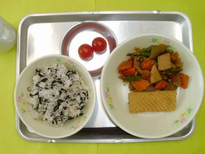 梅若ごはん いかの松笠煮 いりどり ミニトマト 牛乳