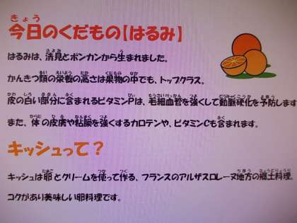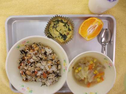 3月18日(火) 今日の給食 公開日 2014/03/28 更新日 2014/03/28 今日の献立 《献立》 《残菜率》 ☆ひじきピラフ 5.7 ☆ほうれん草のキッシュ 4.6 ☆野菜スープ 2.0 ☆はるみオレンジ 0.5 ☆牛乳 1.5 主な産地 にんじん 千葉 ほうれん草 清瀬 たまねぎ 北海道 きゃべつ 愛知 はるみオレンジ 広島 マッシュルーム 山形 とりにく 岩手 いいね(0)