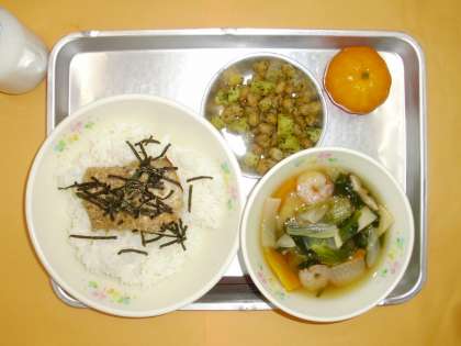 めかじきの味噌ステーキ丼 八宝汁 豆じゃがころ揚げ 冷凍みかん 牛乳