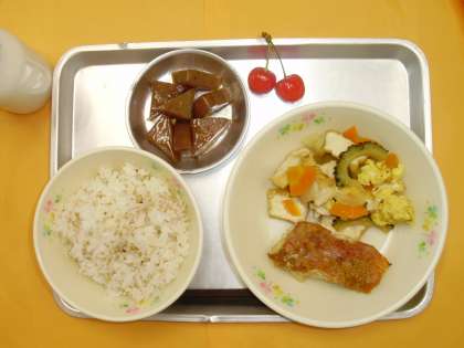 ごまごはん 赤魚の香味焼き ゴーヤチャンプル ピリ辛こんにゃく さくらんぼ 牛乳