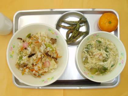 夏の五目寿司 冬瓜とおくらの卵スープ きびなごの唐揚げ 冷凍みかん 牛乳