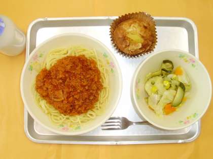 スパゲティミートソース フレンチサラダ パイナップルケーキ 牛乳