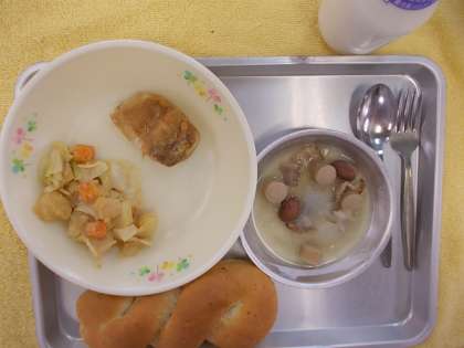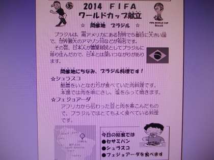 6月12日(木)サッカーワールドカップブラジル料理 公開日 2014/06/16 更新日 2014/06/16 今日の献立 《献立》 《残菜率》 ☆セサミパン 4.3 ☆シュラスコ 1.8 ☆ボイルポテトの ドレッシング和え 5.0 ☆フェジョアーダ 8.0 ☆牛乳 5.6 主な産地 とりにく 岩手 きゃべつ 愛知 じゃがいも 長崎 にんじん 千葉 たまねぎ 栃木 にんにく 青森 いいね(0)