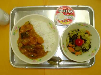 夏野菜のカレーライス わかめサラダ ミニトマト デザート 牛乳