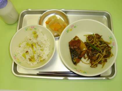 さつまいもごはん さばの味噌煮 変わりきんぴら 南蛮漬け 牛乳