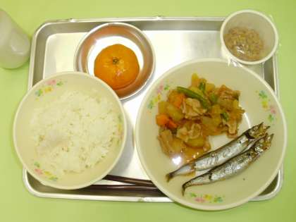 ごはん 納豆 焼きししゃも 韓国風肉じゃが 冷凍みかん 牛乳