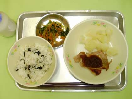 わかめごはん 豚肉のりんごソース 粉ふき芋 ごまあえ 牛乳