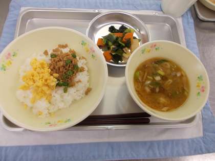 白いご飯の上に、甘辛いとりそぼろと、ふんわりしたいり卵をのせました。