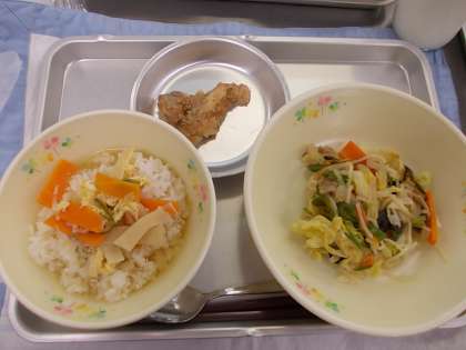 クッパは韓国の雑炊のような献立です。ご飯、鶏肉、ほたて、野菜、卵
