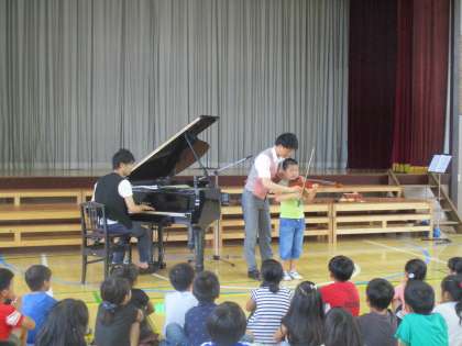 ピアノとバイオリンの演奏に聞き入ったり、一緒にリズムをとって楽しんだりしました。