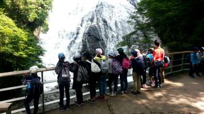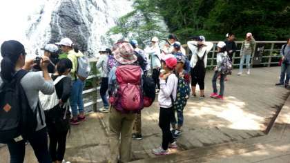 湯滝からネイチャーガイドさんの説明を受けながらハイキングに出発しました。湯川の水はきれいで冷たくて気持ちいいです。