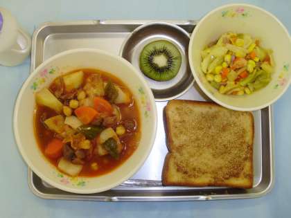 セサミトースト ボルシチ ホットサラダ くだもの 牛乳