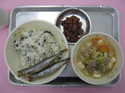 ☆ わかめごはん 焼きししゃも みそけんちん汁 金時豆の甘煮 ☆