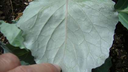 3年生の花壇のキャベツにモンシロチョウの卵がつきました。