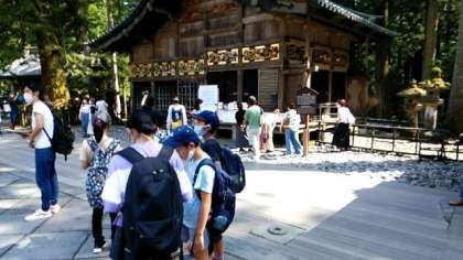 東照宮を班ごとに見学しました。決められたポイントで事前に学習したことをメンバーに説明するガイドをしました。三猿と陽明門です。陽明門は雨漏りの緊急工事で全部綺麗に見られませんでした。