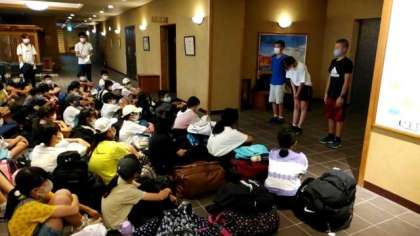 全員無事に宿舎に着いて到着の会をして部屋に入りました。このあとお風呂に入ります。源泉掛け流しが楽しみです。