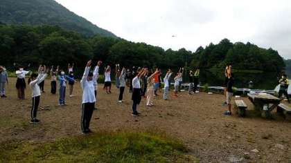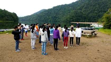 おはようございます。6時に起床して湯の湖の湖畔で朝のつどいを行いました。全員元気です。