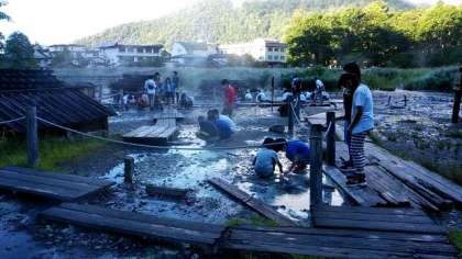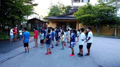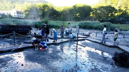 おはようございます。いよいよ最終日です。宿舎前で朝のつどいを行ったあと、温泉が湧いている源泉を見学に行きました。全員元気です。