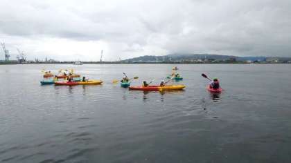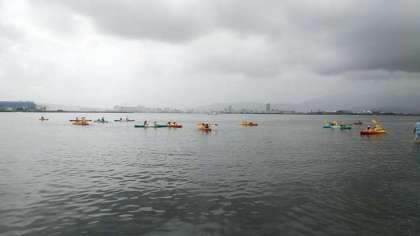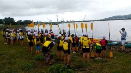 午後はカヌー体験です。漕ぎ方を教わって沖に出ました。雨が降ったり止んだりですが、とても楽しい体験です。