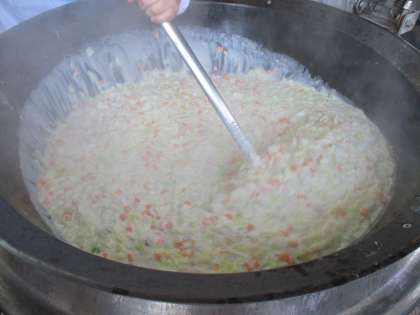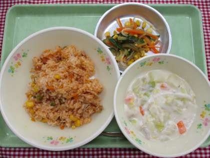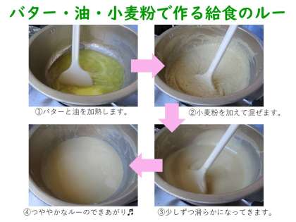 今日は、旬の春キャベツを使って「春キャベツのクリーム煮」をいただきました。学校給食では、バター、油、小麦粉でルーを手作りしています。その変化は、写真のとおり。焦がさぬように、調理員さんが食材の変化を見て、音を聞いて、香りをかいで、火加減をその都度調整しながら、丁寧につくり上げてくれました。