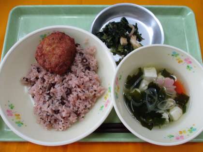今日は、入学・進級のお祝いで、赤飯とお祝いすまし汁をいただきました。