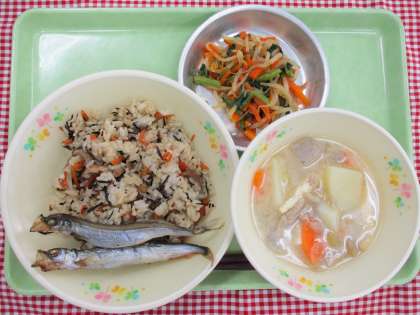 ひじき、油揚げ、にんじん、干ししいたけを砂糖、しょうゆ、酒で炒りつけて具を作りました。ごはんは、ほのかな茶色(茶飯)にするためにしょうゆを少々入れて炊きました。