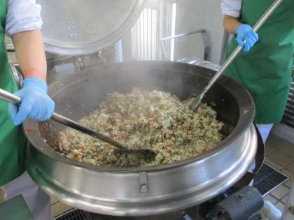 写真は、ごはんと具を混ぜ合わせて、ひじきごはんを仕上げているところです。調理員さんによると「回転釜の底に1/3量の具を加え、その上にごはん、またその上に具…と、交互に加えてから、2人体制(左側・ごはんと具を混ぜる担当、右側・ほぐす担当)で混ぜると、ごはんと具がむらなくきれいに混ぜ合わさります」