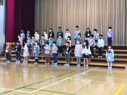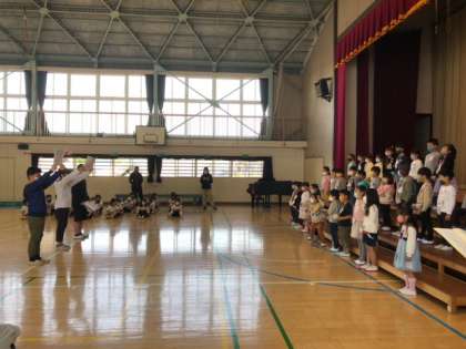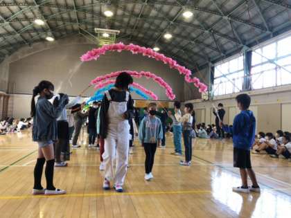 そして、校歌を歌い、代表委員から「歓迎の言葉」、1年生の出し物、6年生の出し物等と行われました。