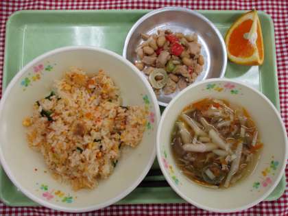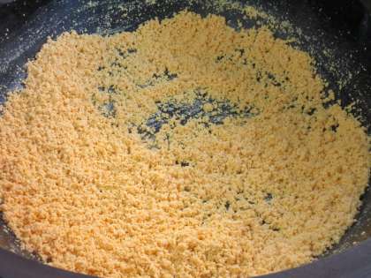オレンジ、きいろ、みどり。色鮮やかな「キムチたまごチャーハン」。写真は、チャーハンの具・炒り卵を作っているところです。