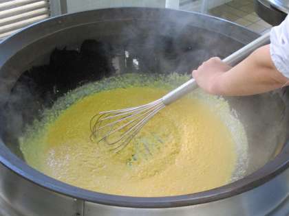 炒り卵を作るときのポイントは、火加減。卵の加熱による変化を見極めながら、火加減を調整して作ります。そして炒り卵ができたら、回転釜からすぐに取り出します。これは、回転釜の色が炒り卵にうつってくすんでしまうのを防ぐためです。
