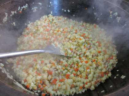 写真は、ピッティパンナを作っているところです。バターで玉ねぎをしんなりするまで炒めた後、ウインナー、蒸したじゃがいも・にんじん・ホールコーン・グリンピースを加えて炒め、塩こしょうで味を調えました。