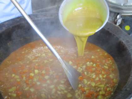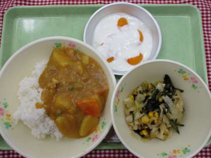 写真は、鶏肉・玉ねぎ・にんじん・じゃがいもを煮て、トマトケチャップ・ウスターソース・塩こしょう・カレー粉・しょうゆで味を調えた後、手作りルーを加えて煮込むところです。食材のうまみとコクが出ているチキンカレーライスは、子ども達にも人気でした。