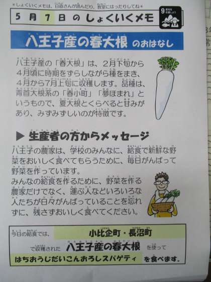 八王子市内の小比企町は、市内で最も広い面積の畑があります。そこでは、江戸東京野菜と呼ばれる、江戸時代からつくられている野菜などもつくっています。今日の献立で使われている大根も八王子市内でつくられた大根です。市内でつくられたものをおいしくいただきましょう。