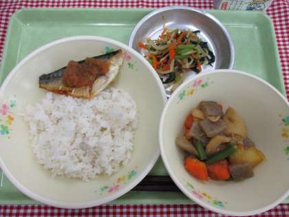 はしの「先」を上手に使ってさばを食べやすいように、ひと口大に「切り裂いて」食べます。給食時間中に教室をのぞくと、がんばっている姿が見受けられました。